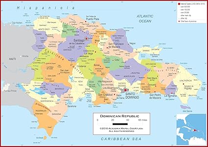 Political map of the dominican republic. It occupies the eastern five eighths of the island which it shares with the nation of haiti making hispaniola one of two caribbean islands along with saint martin that are shared by two countries the dominican republic is the second largest caribbean nation by area after cuba at. Geographic projection has straight meridians and parallels each degree of latitude and longitude is the same size over the entire world map. Map is showing dominican republic the country that occupies the eastern part of hispaniola an island in the greater antilles in the caribbean sea located south east from cuba and west from puerto rico.